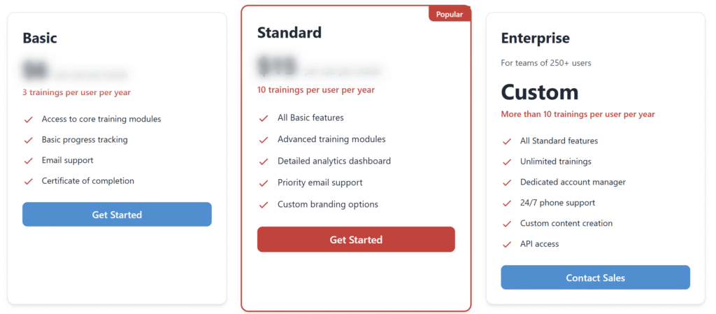For larger enterprises or regulated sectors, the Enterprise plan offers the highest level of flexibility, scalability, and support. It combines all features of the Standard plan with unlimited trainings, custom content creation, dedicated account management, and API integrations—ensuring every part of your awareness program can be measured, reported, and continuously improved.